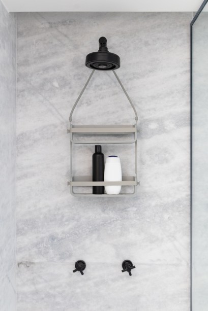 Já o banheiro ganhou atmosfera minimalista tátil, onde predominam os tons de cinza e branco dos revestimentos, acentuados pelos detalhes em preto dos metais e acabamentos. O aspecto tátil é dado pelo piso que, com sua textura, remete à sensação de se estar pisando em delicados seixos rolados.