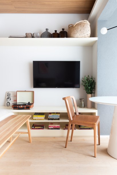 Esse decorado reúne cozinha, quarto e banheiro. Com um projeto inteligente que privilegia a multifuncionalidade, o apartamento recebeu um generoso banco em marcenaria. Começando na cozinha, percorre todo o apartamento, concentrando vários usos. Espaços para armazenamento e assentos para a mesa de refeições compartilham a mesma estrutura – soluções para uma vida mais prática e integrada.