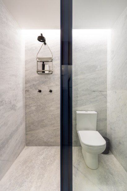Do lado oposto à cozinha, as paredes de alvenaria do banheiro foram substituídas por estruturas em blindex, permitindo que a luz natural da varanda chegasse até este espaço. A pia foi posicionada ao lado, integrada ao quarto, permitindo um uso separado em relação ao banheiro.