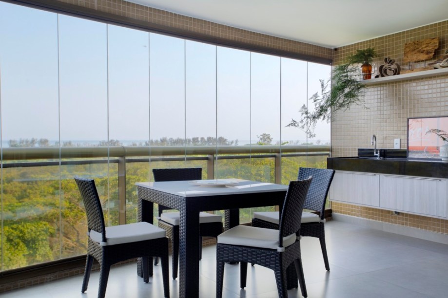 O piso da varanda gourmet foi nivelado com o da sala e recebeu o mesmo revestimento de porcelanato cinza. É nesse ambiente que a família costuma tomar café da manhã enquanto aprecia a vista deslumbrante da Barra.