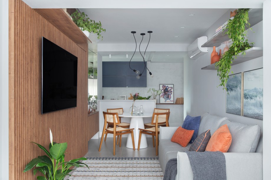 A reforma, assinada pelo SketchLab Arquitetura, integrou a cozinha e a varanda, criando uma área social ampla e colorida