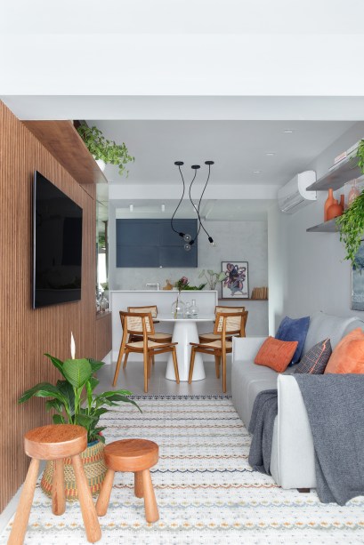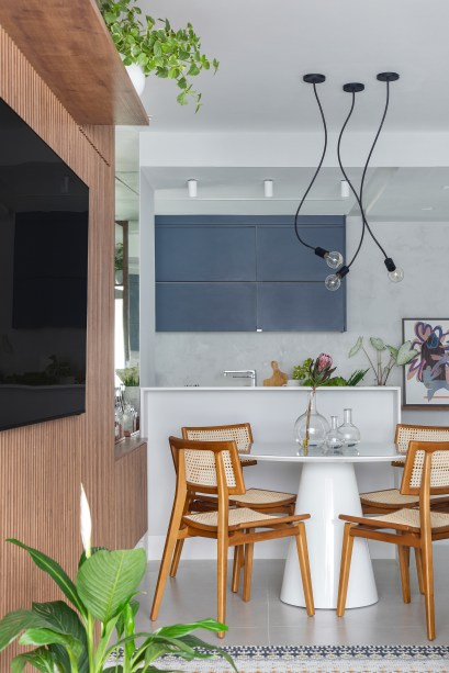 O casal de moradores deste apartamento de 85m² no Rio encomendou um projeto de reforma completa às arquitetas Luana Bergamo e Luiza Mesquita, do escritório SketchLab Arquitetura. “eles pediram uma cozinha aberta para a sala e a criação de um quarto de hóspedes que servisse também para jogos, onde o morador pudesse receber seus amigos”, acrescenta ela. Outro desejo dos clientes foi a presença de azul no décor, já que a cor é a favorita de ambos.
