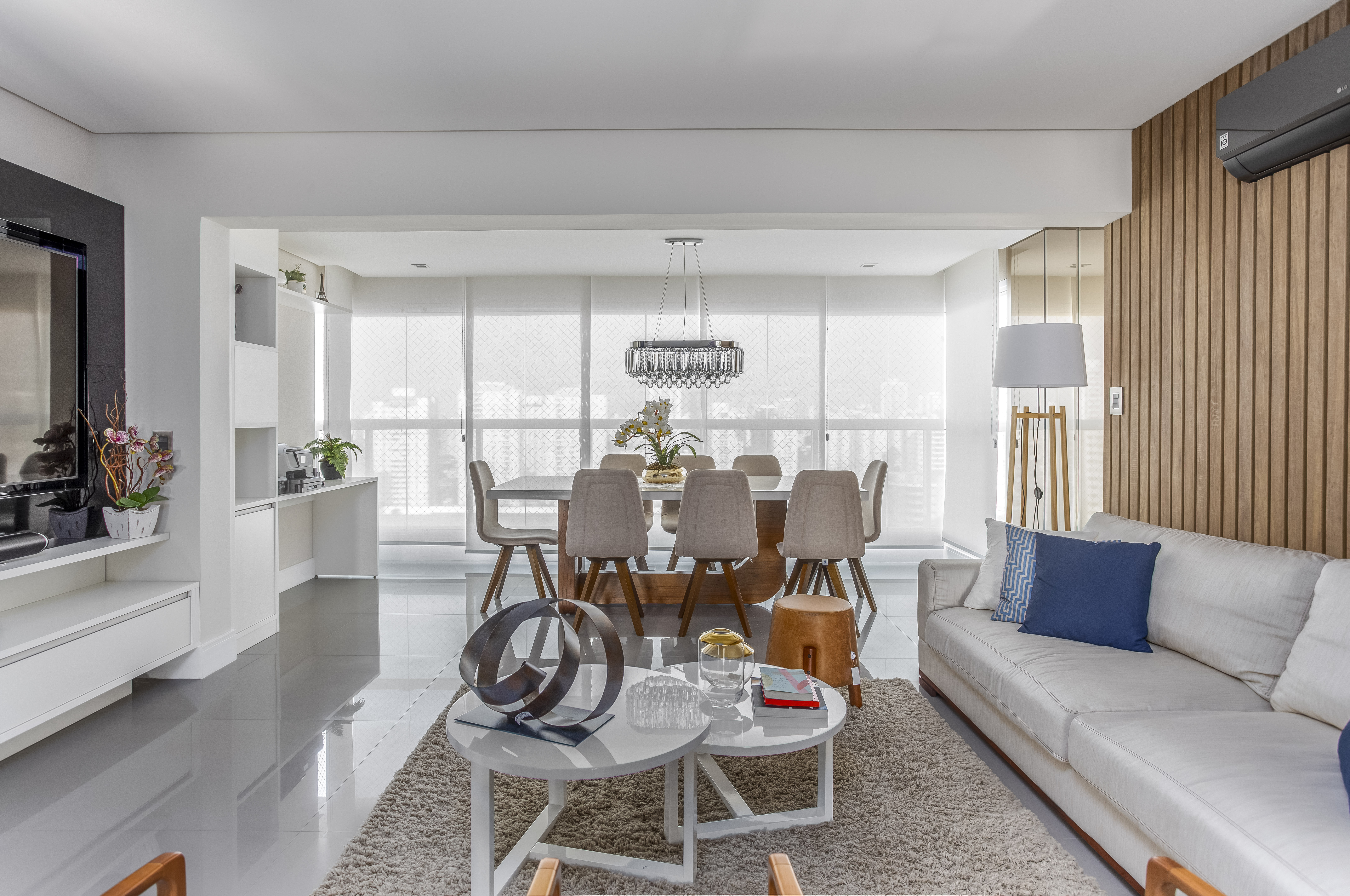 Nos quatro ambientes conectados, os arquitetos apostaram no piso de porcelanato cinza para dar a sensação de amplitude e continuidade. Outra solução adotada pelos arquitetos foi a retirada das portas de correr que separavam a varanda da área social: sem elas, a sala de jantar ocupou a varanda, proporcionando o privilégio da família realizar as refeições enquanto apreciam o skyline da cidade.