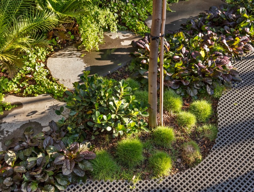 Atrás, em uma área mais reservada, foi instalada a cozinha com marcenaria clara e minimalista toda integrada com quintal por meio de portas de correr. Na lateral, um corredor dá acesso a ambos os blocos em um caminho cercado de vegetação. Além de ser um espaço para reunir a família, o quintal possibilita a entrada de muita luz natural para os ambientes.