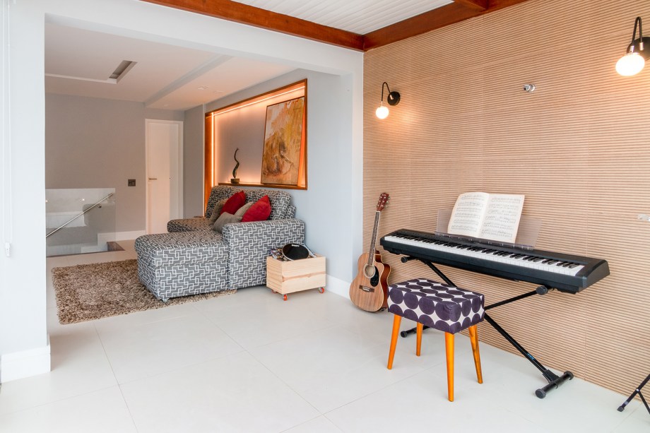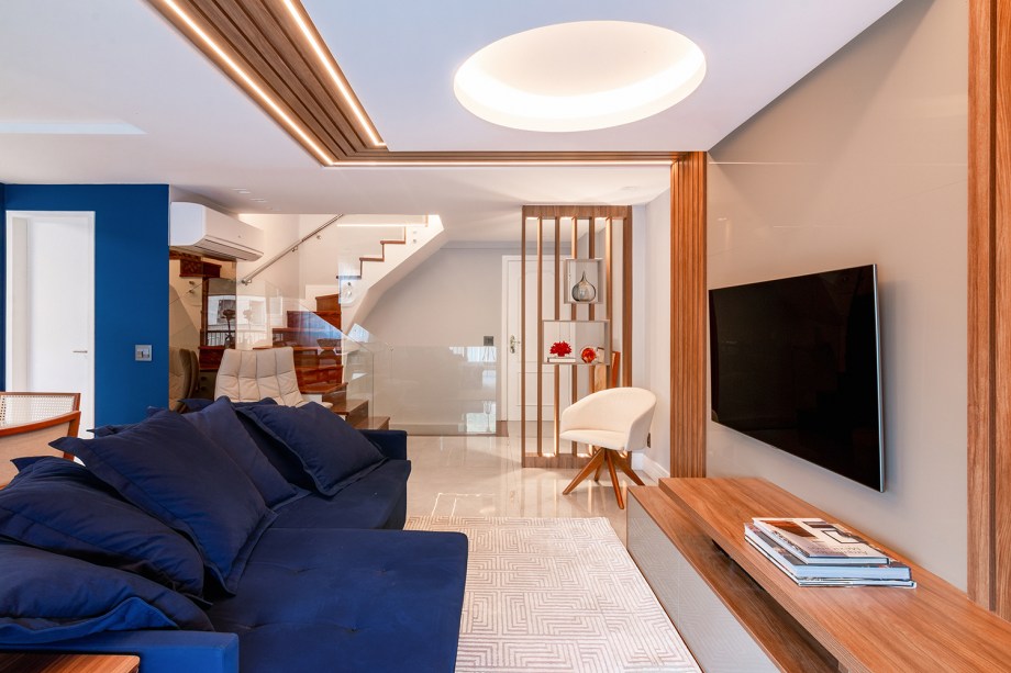 Para o décor, foi usada muita marcenaria, imprimindo um ar elegante aos ambientes. Na sala principal, um painel que se espalha por parede e teto chama a atenção pelo belo design. “Dois elementos desse projeto são xodós meus: as divisórias em madeira que criamos para a sala e para a cobertura”, conta a arquiteta.