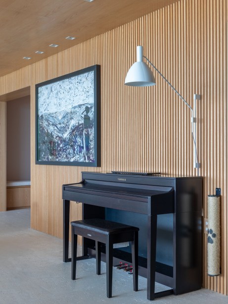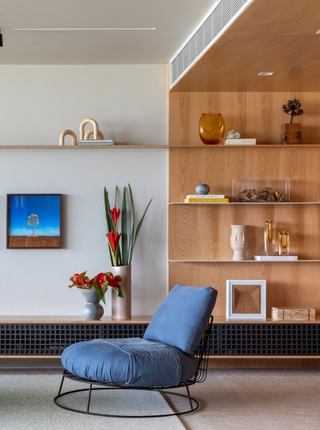 No geral, o projeto buscou criar um lar atemporal e aconchegante para a família, tendo como maior desafio preencher de forma inteligente os espaços amplos e integrados que compõem a área social. Para atender à solicitação por um espaço de coworking, surgiu a ideia de criar uma grande “caixa” camuflada no painel de madeira ripada da sala, com portas que abrem e fecham em sistema camarão, permitindo isolar completamente o espaço e o hall de entrada da sala, quando necessário.