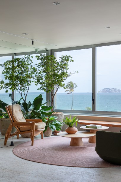 O escritório Up3 Arquitetura trabalhou com linhas finas e uma paleta de cor com tons beges, terrosos e verdes para valorizar a vista para Ipanema