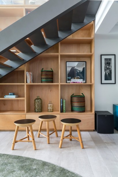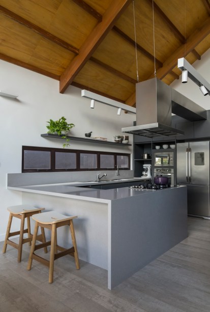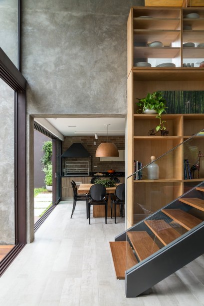 O layout também sofreu mudanças drásticas. A ideia era que o a casa fosse prática tanto para o dia a dia quanto para os momentos de festas em família e com os amigos. Assim, os arquitetos aproveitaram o declive do terreno para dividir os ambientes em dois níveis, de modo que a área íntima ficasse no térreo, ao nível da rua, e a social na parte debaixo, antes usada como estacionamento e área de serviço.