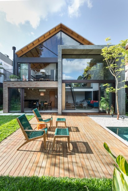 Para a fachada que se mostra para a rua, os arquitetos desenharam um formato das casinhas de desenhos animados, que esconde a vista dos fundos e os espaços integrados do imóvel. Já a face dos fundos, se abre para a paisagem arborizada do bairro.
