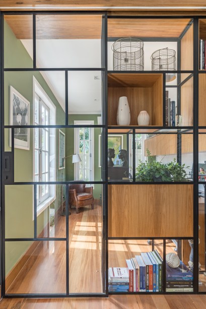 O home office ganhou uma área relativamente integrada, com uma estante fechada com vidro, que traz isolamento acústico, mas que privilegia a integração e a acústica do espaço. O espaço fica logo na entrada da casa, ao lado do hall com elevador.