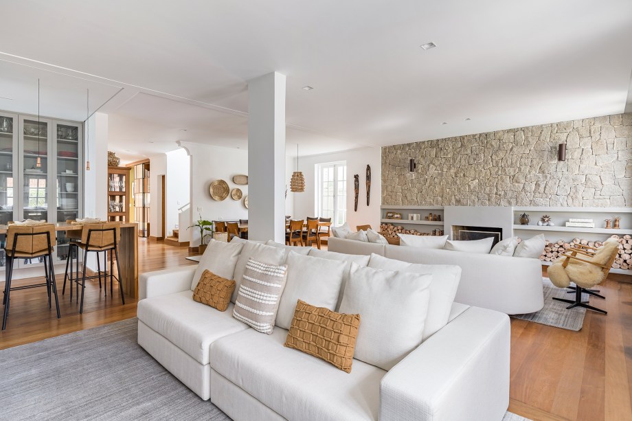 O piso original de assoalho na área social foi recuperado, assim como a estrutura original da madeira foi mantida – aqui só foi trocado o revestimento pela pedra Moledo.