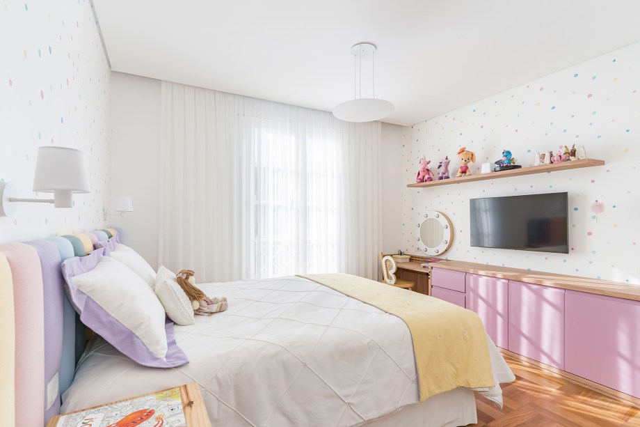 O quarto das crianças trouxe personalidade com papéis de parede e marcenaria coloridos, garantindo um toque lúdico, sem deixar a funcionalidade de lado. A bancada de estudos possui bastante espaço para armazenamento.