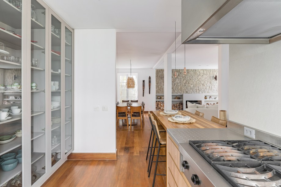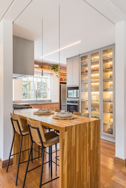 A reforma partiu da vontade de integrar a cozinha com a área de estar e destacar as generosas janelas, iluminação e pé-direito alto.