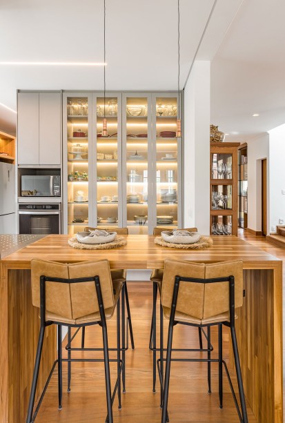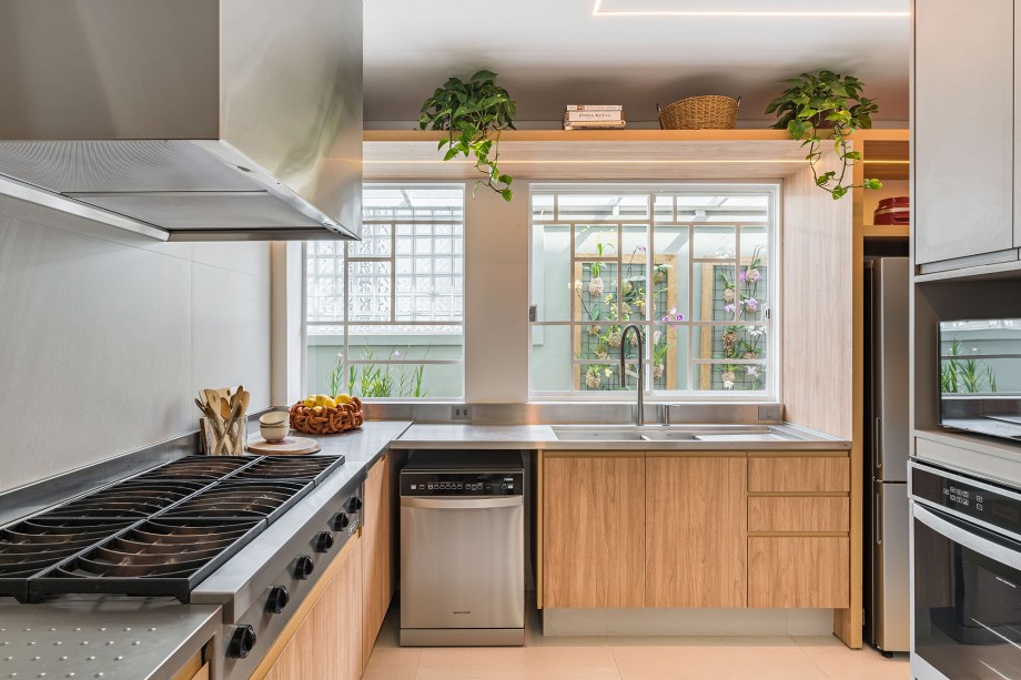 “A cozinha foi a protagonista central e recebeu equipamentos industriais, bancada de inox e teve todos os detalhes minuciosamente pensados para acolher as deliciosas receitas da cliente”, conta a arquiteta.