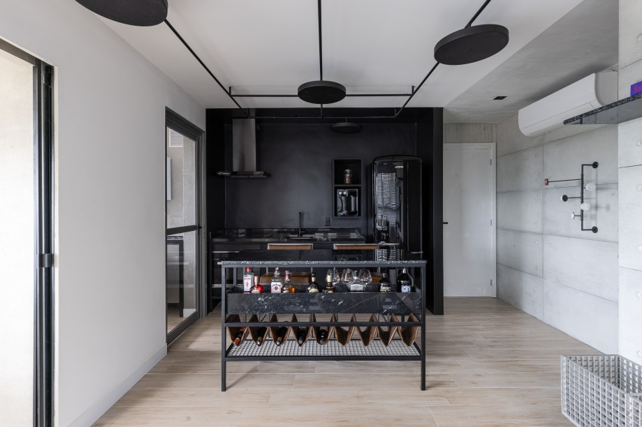 A cozinha está em meio a área social, portanto o uso da cor preta ajuda a “apagar” esse espaço e criar uma sombra na caixa em que está concentrada, para iluminar mais o restante que deve ter mais destaque.