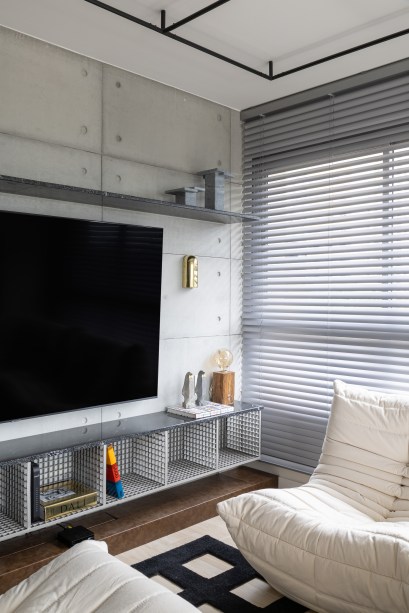tem como partido a exploração de diversos grids. Elementos como a chapa perfurada, quadriculados em serralheria, desenho da iluminação em plafons, escolha do revestimento da parede principal que forma um padrão retangular em placas de concreto o tapete do estar compõem a atmosfera industrial e urbana.