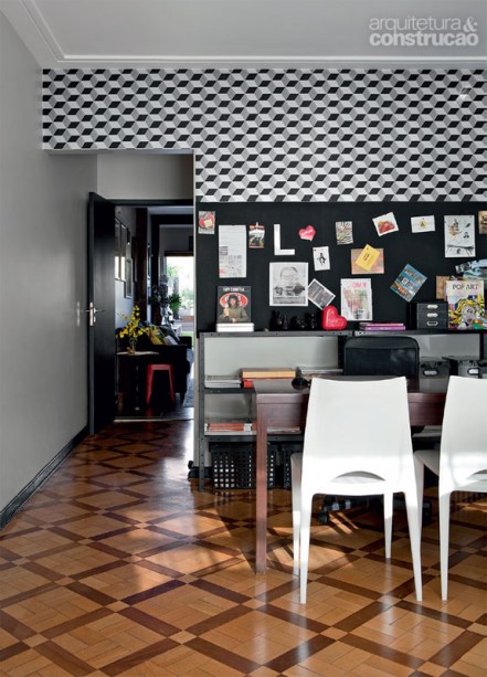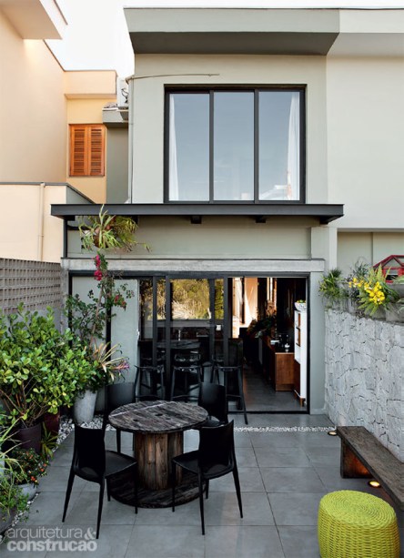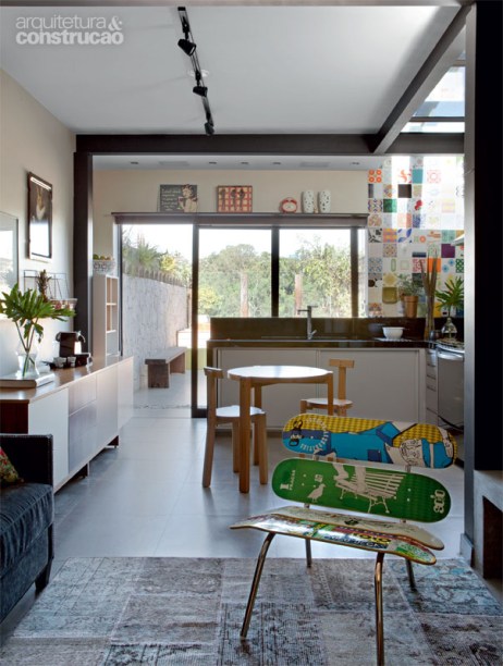 “Costumava sair a pé para almoçar na Vila Madalena, reduto de arte e gastronomia na zona oeste, onde mantinha meu escritório de arquitetura. Numa das caminhadas, encontrei este sobrado à venda. Arrebatada pelo desenho do piso de tacos da sala – que, hoje, é meu espaço de trabalho –, subi até os quartos e, ao espiar a paisagem emoldurada na janela, teclei no celular: ‘Amor, achei a nossa casa!’. Na hora, percebi a possibilidade de criar uma área ampla e multifuncional. É a minha cara ter a cozinha integrada ao estar, referência forte dos tempos da infância na morada de minha avó. Meu marido, Adriano Panda Leal, publicitário, viu no subsolo com garagem o lugar perfeito para a pista de dança das festas que organizamos, e o revestiu de cartazes lambe-lambe. O deck de plástico reciclado e os vidros reaproveitados evidenciam nosso estilo despojado e a aposta em materiais de baixo impacto ambiental. Desembolsamos R$ 160 mil na reforma. Do total, reservamos bem pouco para a decoração. A maior parte foi usada na obra, de quatro meses, para adequar o imóvel ao nosso jeito. Como sou disciplinada, o home office facilitou minha vida. Quando estou no escritório, sequer atendo o telefone residencial, e vice-versa. Também evito reuniões em horários conflitantes com a rotina do lar.” Lays Sanches, moradora