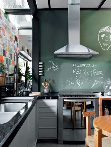 – Lousa lavável: esqueceu a receita? É só anotar na parede de esmalte fosco verde escolar (Suvinil). Os rabiscos de giz saem com apagador ou água e detergente.