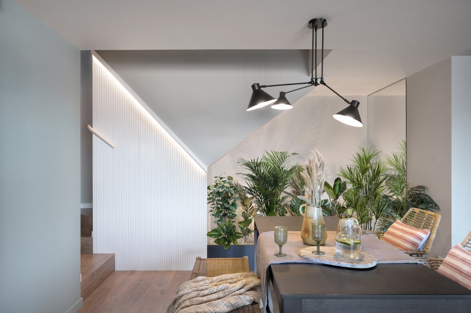 A escada que dá acesso ao solário fica na sala e jantar e ganhou floreiras na parte inferior.