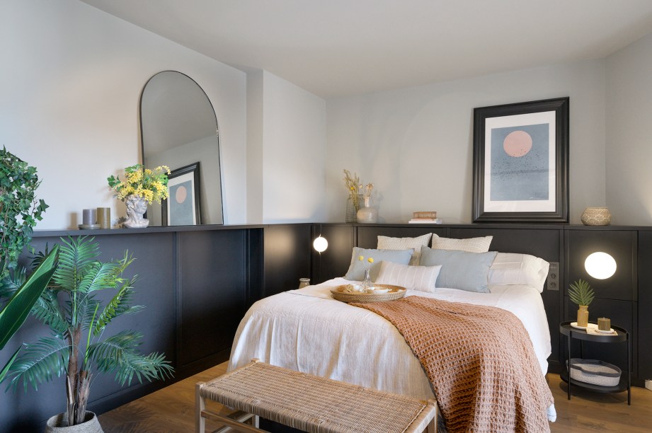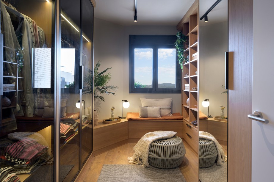 Já no quarto principal, a meia parede azul confere relevo, cor e forma a todo o ambiente e também serve como prateleira e superfície para as luzes de cabeceira. O closet ganhou marcenaria que acompanha o layout irregular e um banco baú abaixo da janela.