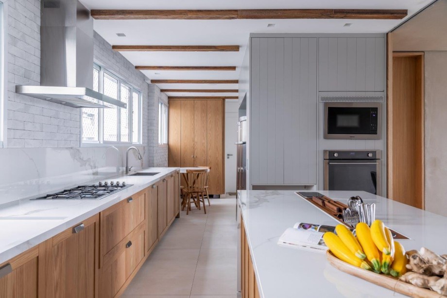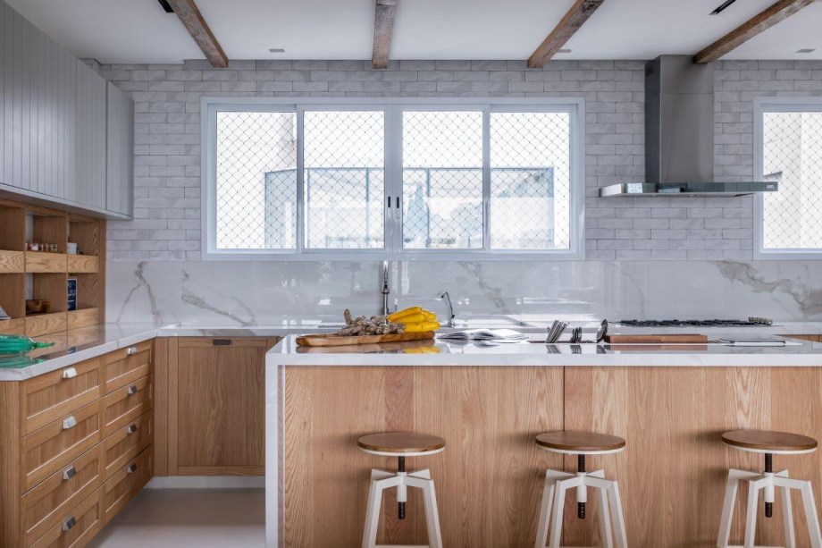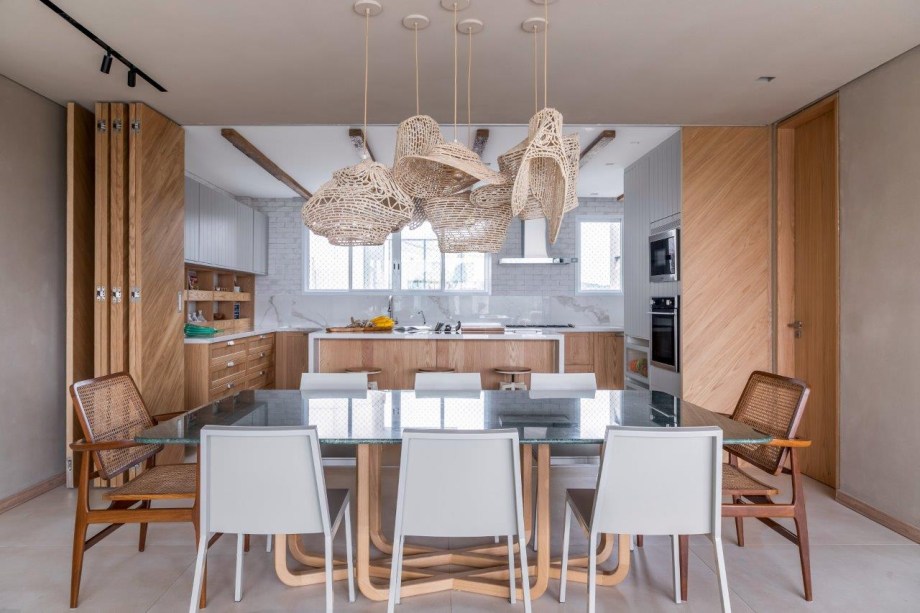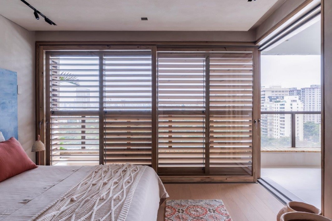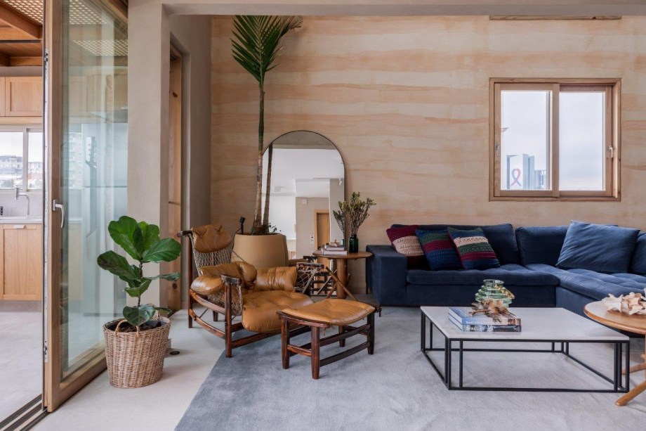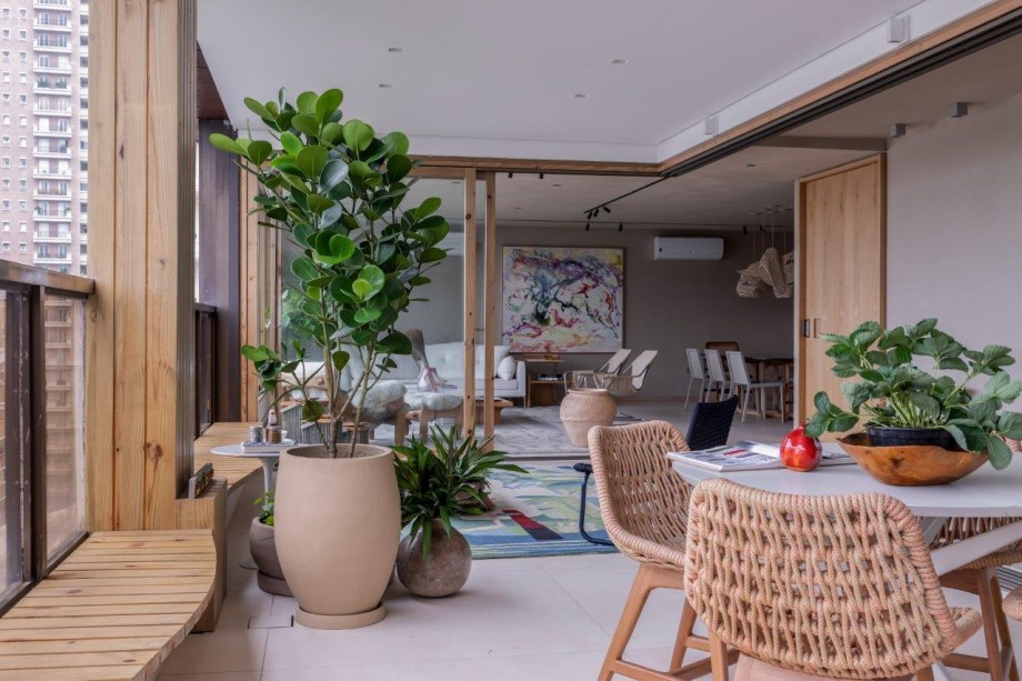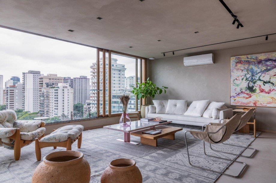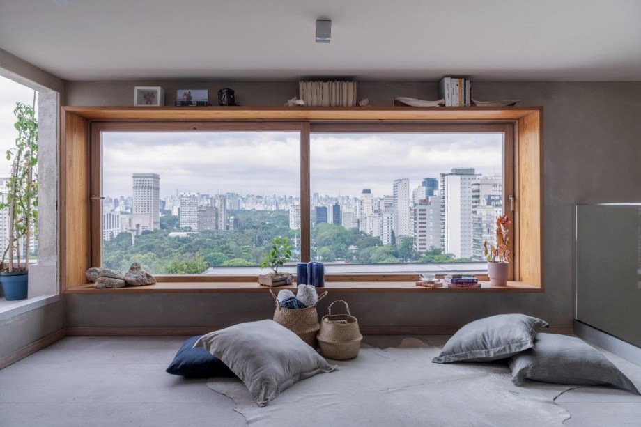 Grandes janelões de madeira proporcionam ampla iluminação natural no apartamento da arquiteta Helô Marques