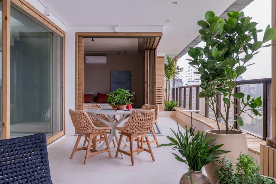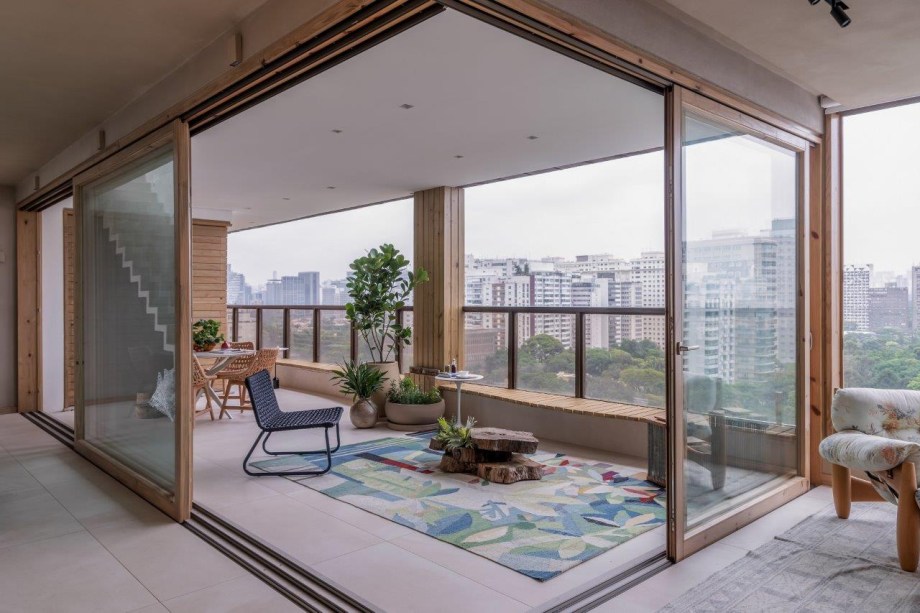 Grandes janelões de madeira proporcionam ampla iluminação natural no apartamento da arquiteta Helô Marques