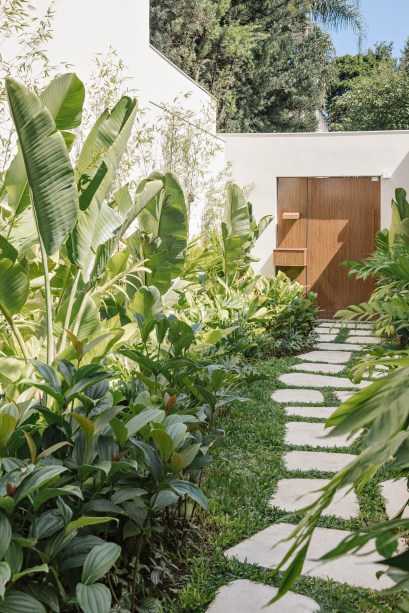 Para tirar proveito máximo da área externa, o arquiteto criou grandes aberturas na construção. “Queria que a casa fosse harmônica e que sua volumetria ficasse discreta para destacar a vegetação”, conta. A arquitetura, então, foi pensada para ser neutra e deixar o verde como protagonista.