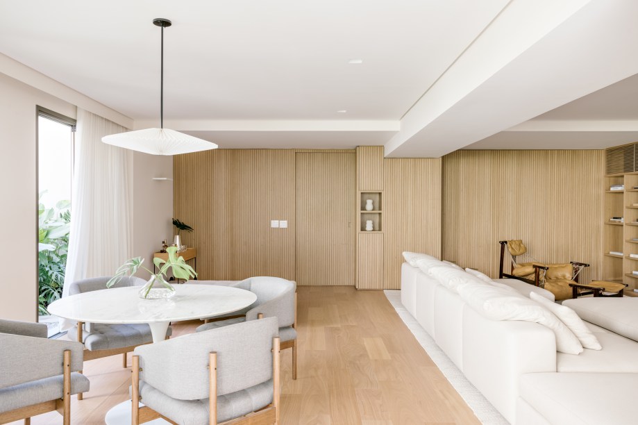“O forro da sala foi um grande desafio, pois tivemos que minimizar os diferentes pés direitos por causa do rebaixo dos banheiros e da estrutura da casa. E fazer o forro contínuo não era uma possibilidade, pois o teto ficaria baixo demais”, aponta o arquiteto.