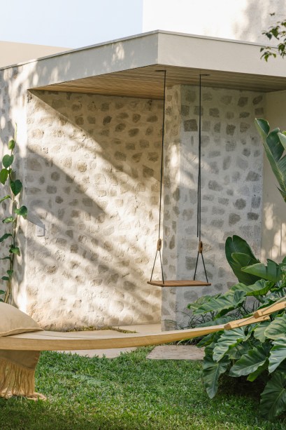 O jardim ganhou locais contemplativos com redes, balanço e firepit. Nas paredes, a textura é de terracota e o piso, em conjunto com a grama, traz pisadas assimétricas de granito rústico.