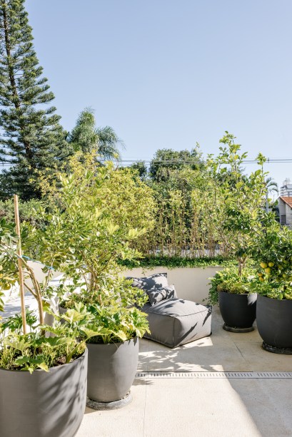 No programa, há quatro quartos e três banheiros no andar de cima, além de um terraço com horta e pomar. No térreo, a garagem abriga quatro carros e divide o espaço com lavanderia, cozinha integrada com jantar, despensa, lavabos, amplo living, escritório, atelier de costura e varanda com cozinha gourmet.