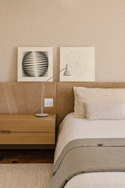 Como os quartos possuem metragens e disposições bem parecidas, a ideia de Dal Fabbro foi explorar diferentes cabeceiras, tecidos, mesas de apoio e demais peças soltas. O piso de taquinho original foi mantido e, nas paredes, há linho natural.