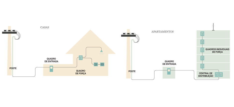 Casas: A concessionária entrega a energia e responde por ela até o quadro de entrada (assim como nos edifícios). Dali em diante, os cuidados cabem ao morador.