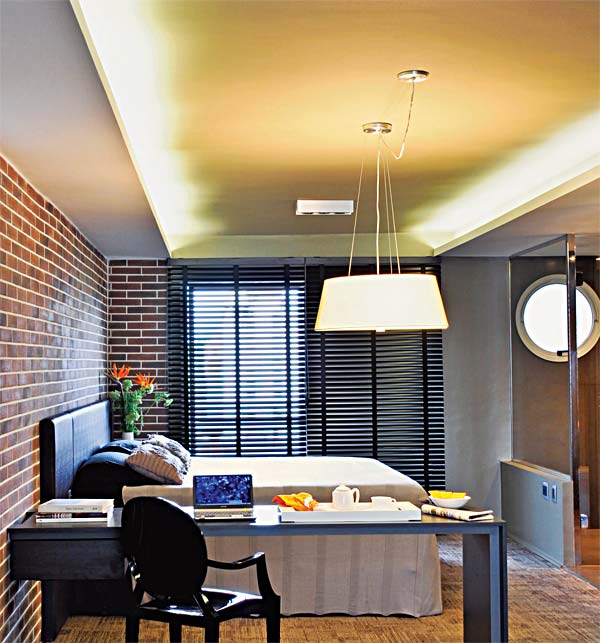 Feita de gesso acartonado liso, a sanca com balanço de 40 cm marca este quarto de apartamento que tem 2,40 m de pédireito. A solução permite embutir as lâmpadas fluorescentes, o que torna a iluminação mais tênue e aconchegante, explica a arquiteta Betty Birger, de São Paulo. A fixação emprega um perfilado metálico chumbado nas paredes 20 cm abaixo do teto. Execução da Construtora Compasso. Na parede, cerâmica da coleção Stones (Gail).
