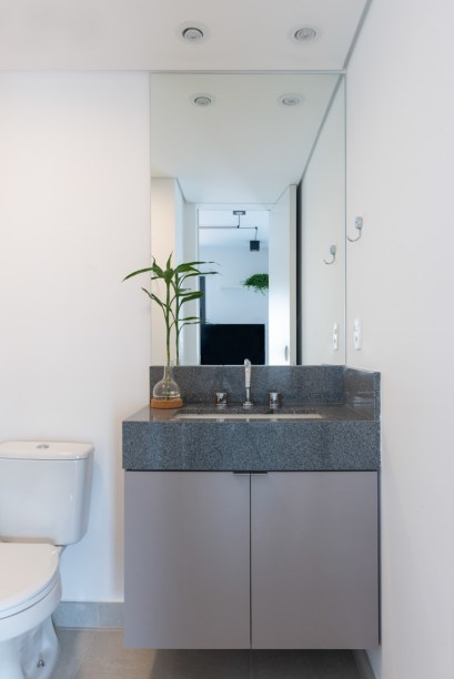 Com isto, o escritório CR2 Arquitetura, sob comando da arquiteta Clara Reynaldo, entrou em cena: propôs uma reforma que deixou o espaço o mais amplo possível, sem separação entre sala, cozinha e quarto; usou materiais resistentes, de baixa manutenção e baixo custo, caso do porcelanato no piso e da fórmica na cozinha; e uma boa iluminação, por isso a predominância do branco nas paredes e no teto, do cinza claro no piso e do guarda-roupa e cabeceira brancas.