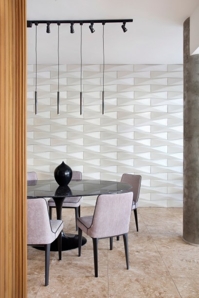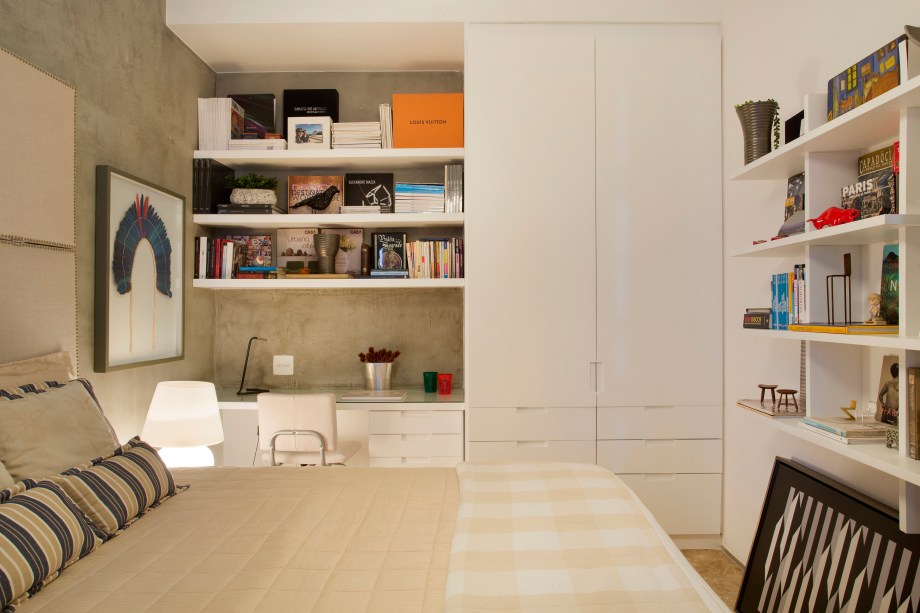 A paleta de cores puxa para o industrial, com tons mais escuros de azul, cimento e madeira ebanizada. Outro destaque do apê é a marcenaria. Os brises, que servem de divisórias, ajudam a aquecer o ambiente, contrapondo-se ao concreto frio. No mobiliário, o estilo contemporâneo predomina.
