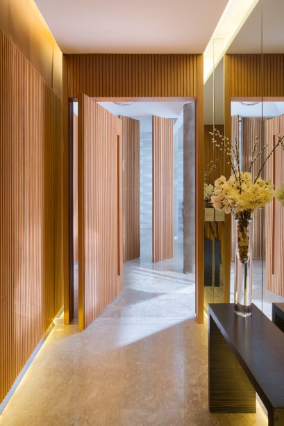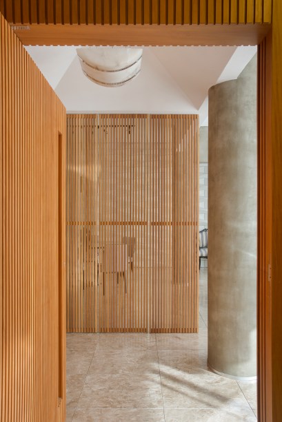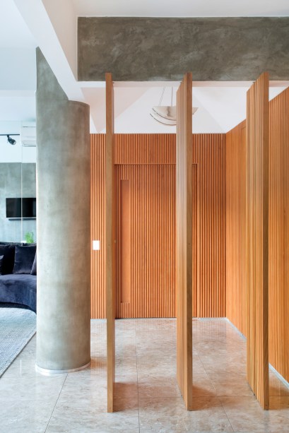 Brises de madeira dividem espaços e aquece o estilo industrial de apê