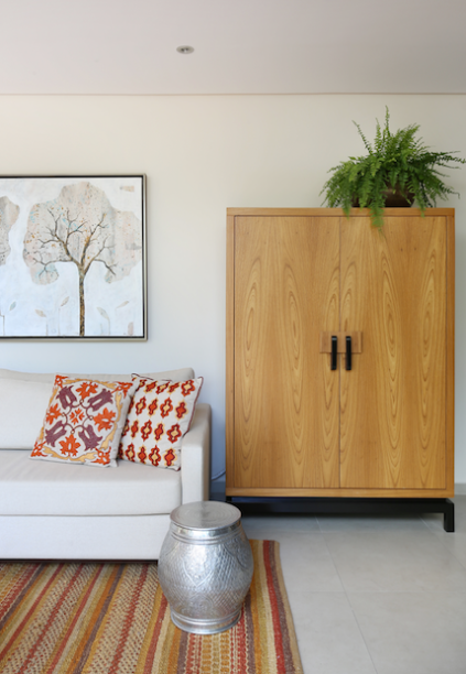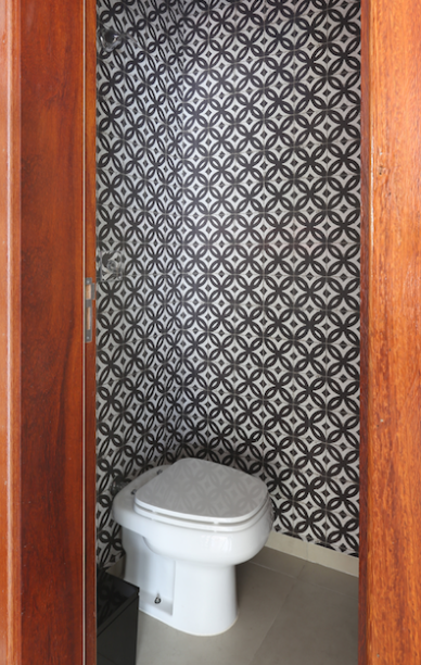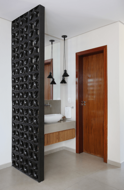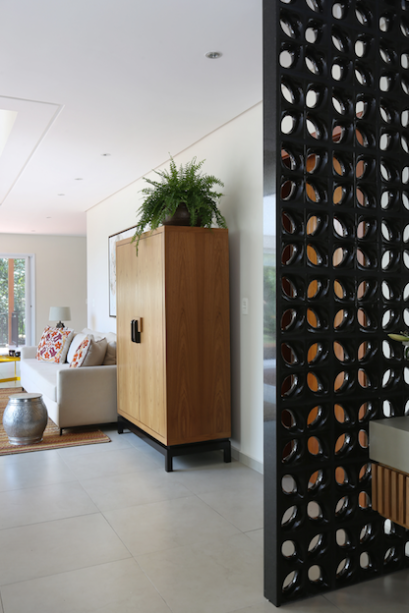 Um destaque da sala foi a reforma do lavabo. Antes, ele ficava apagado no living, mas agora possui uma divisão com cobogós, uma bela pia com madeira ripada e até um papel de parede geométrico, cheio de estilo.