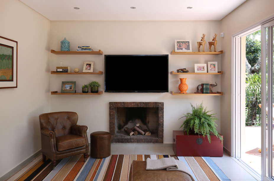 O primeiro passo foi criar a área social, composta por living, home theater, lareira e bar. A sala da casa já era integrada, porém a disposição dos móveis não favorecia a circulação, nem valorizava os ambientes.