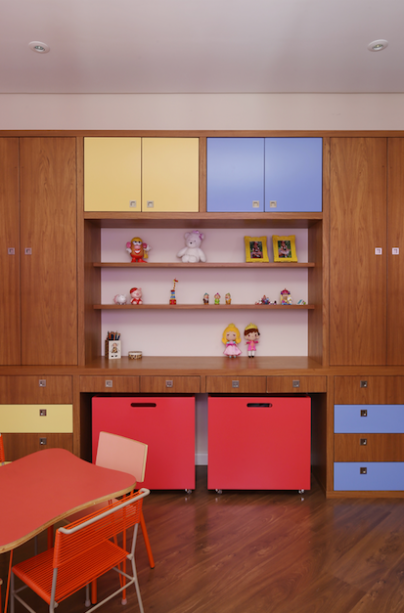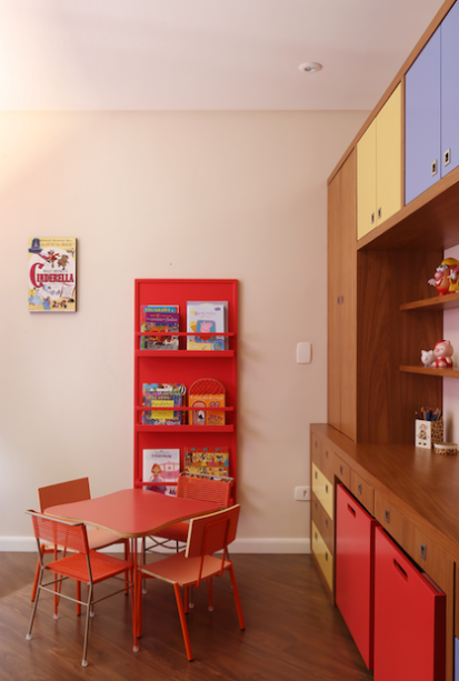 O projeto, assinado pelo Stal Arquitetura, reformou a área social, o quarto das crianças e criou uma brinquedoteca