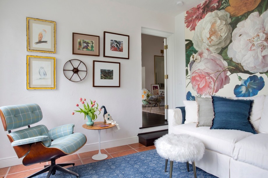 Destaque para as poltronas da sala de estar, que ganharam estofamento novo com tecido floral da marca Designers Guild. Esta, aliás, foi a referência para a paleta de cores do espaço, como a do sofá azul. O papel de parede com estampa de flores gigantes na saleta também chama a atenção e criou um visual impactante e alegre.