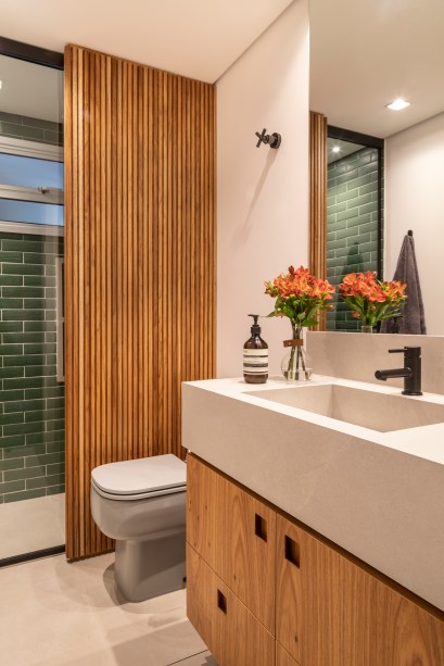 O ponto de destaque no décor fica por conta da madeira freijó, predominante no projeto. Em cada ambiente, porém, ela foi harmonizada com um ponto de cor: na cozinha com a marcenaria terracota, na sala de estar com o sofá azul, no escritório com a marcenaria cinza e nos quartos com a marcenaria azul e verde claro.