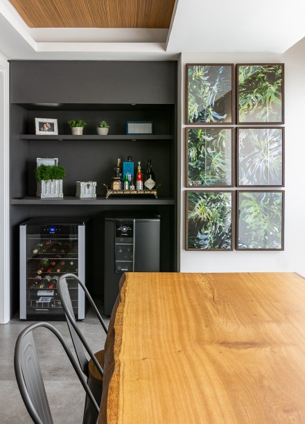Mas, para além de uma decoração de destaque, o projeto conta também com algumas soluções. Dentre elas, há o conforto térmico, proporcionado pela exaustão da churrasqueira individual, que faz o ar se renovar no ambiente e manter tudo fresquinho.