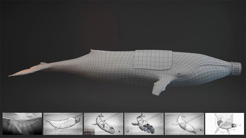Enquanto isso, um grupo de baleias emerge do abismo na forma de um grupo de enormes garrafas de plástico – seus corpos translúcidos abrindo caminho através de um enxame de alforrecas de plástico.