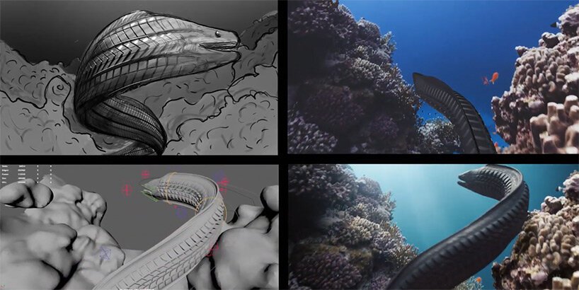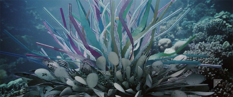 Nesta paisagem subaquática distópica, os animais se tornam a própria poluição e o plástico que os ameaça. Cardumes de chinelos descartados tomam o lugar de peixes, garfos e canudos de plástico tornam-se elementos incorporados à vida vegetal, um baiacu se expande em seu corpo plástico-bolha e uma enguia desliza pelo mar com uma pele feita de pneus de borracha.